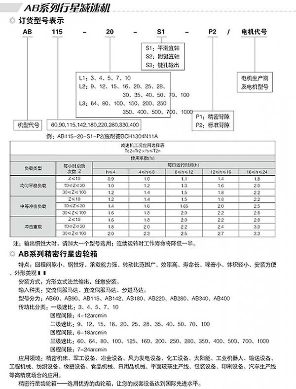 AB系列精密行星减速器是行业内对行星减速机的另一种称呼。它的主要传动结构为:行星轮,太阳轮,内齿圈。相对其他减速机,精密行星减速机具有高刚性、高精度(单级可做到1分以内)、高传动效率(单级在97%-98%)、高的扭矩/体积比、终身免维护等特点。多数是安装在步进电机和伺服电机上,用来降低转速,提升扭矩,匹配惯量。